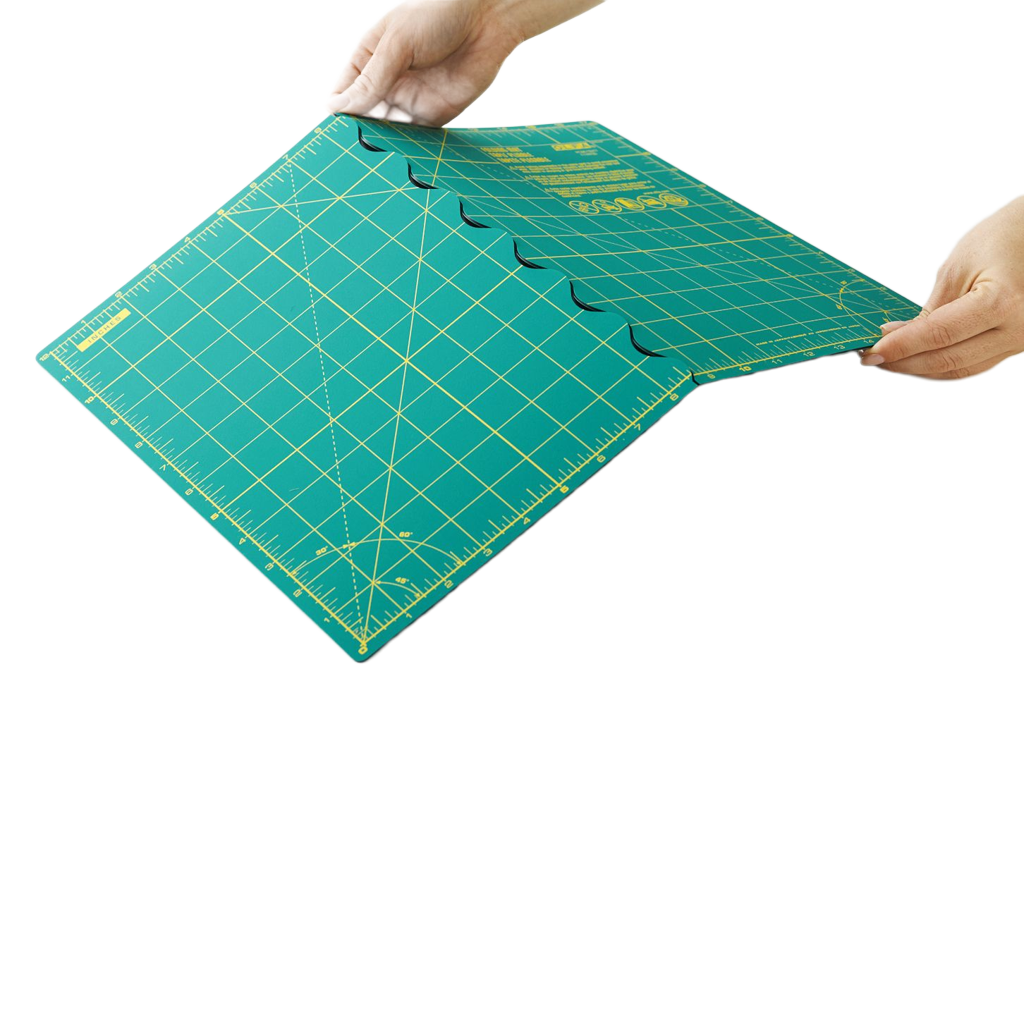 Suport pentru taiat pliabil cu o suprafata unica si material nou care si la indoirea suportului garantează o taiere fara dificultate. Cu cifre lizibile, cu grila metrica si cu cele mai des folosite marcaje de unghiuri. Pe verso se regaseste un strat de burete antiderapant care mareste stabilitatea suportului. Se pot utiliza cutitele patchwork de 9 mm si cutitele de decoratii pe suprafata.
